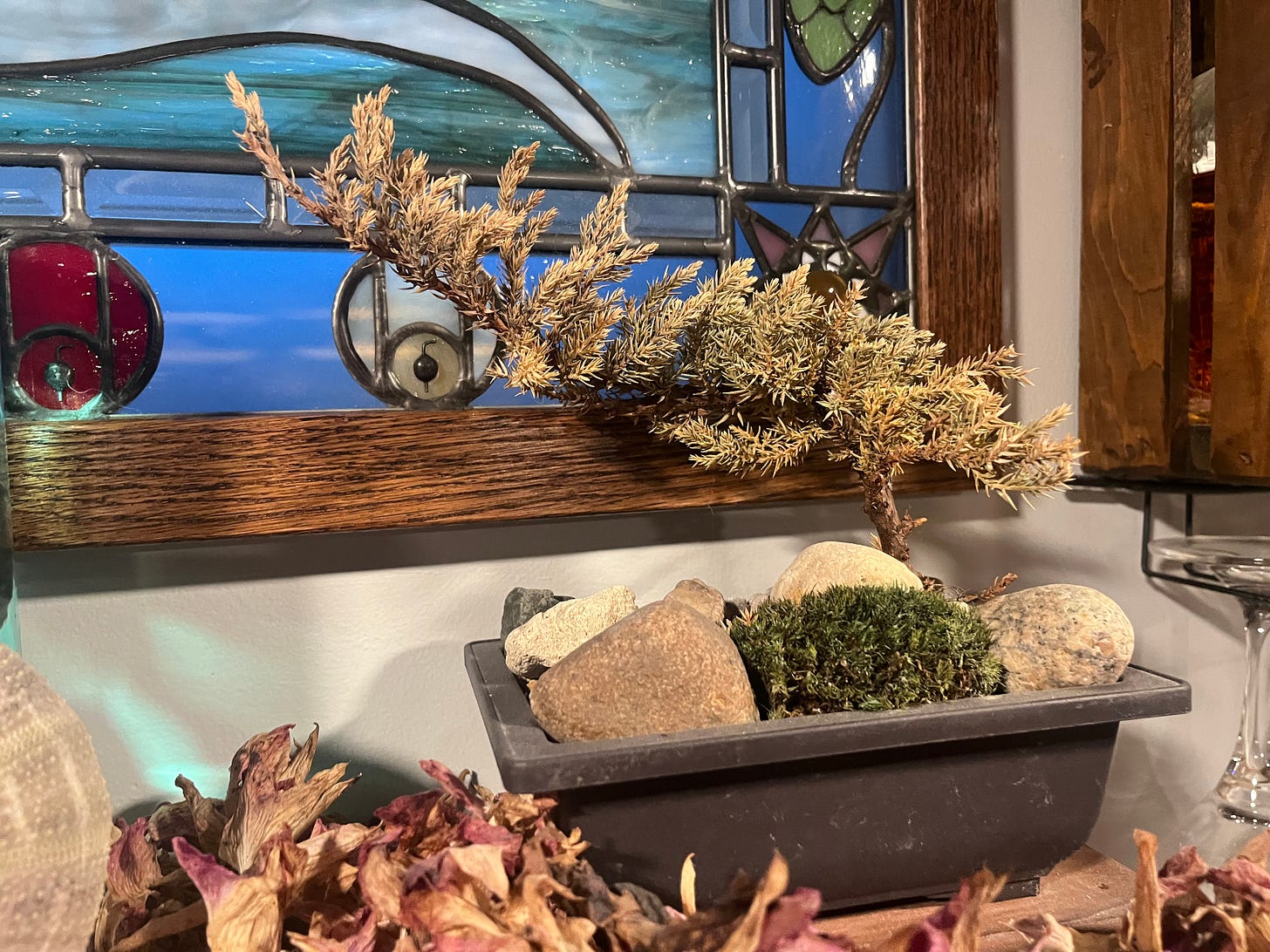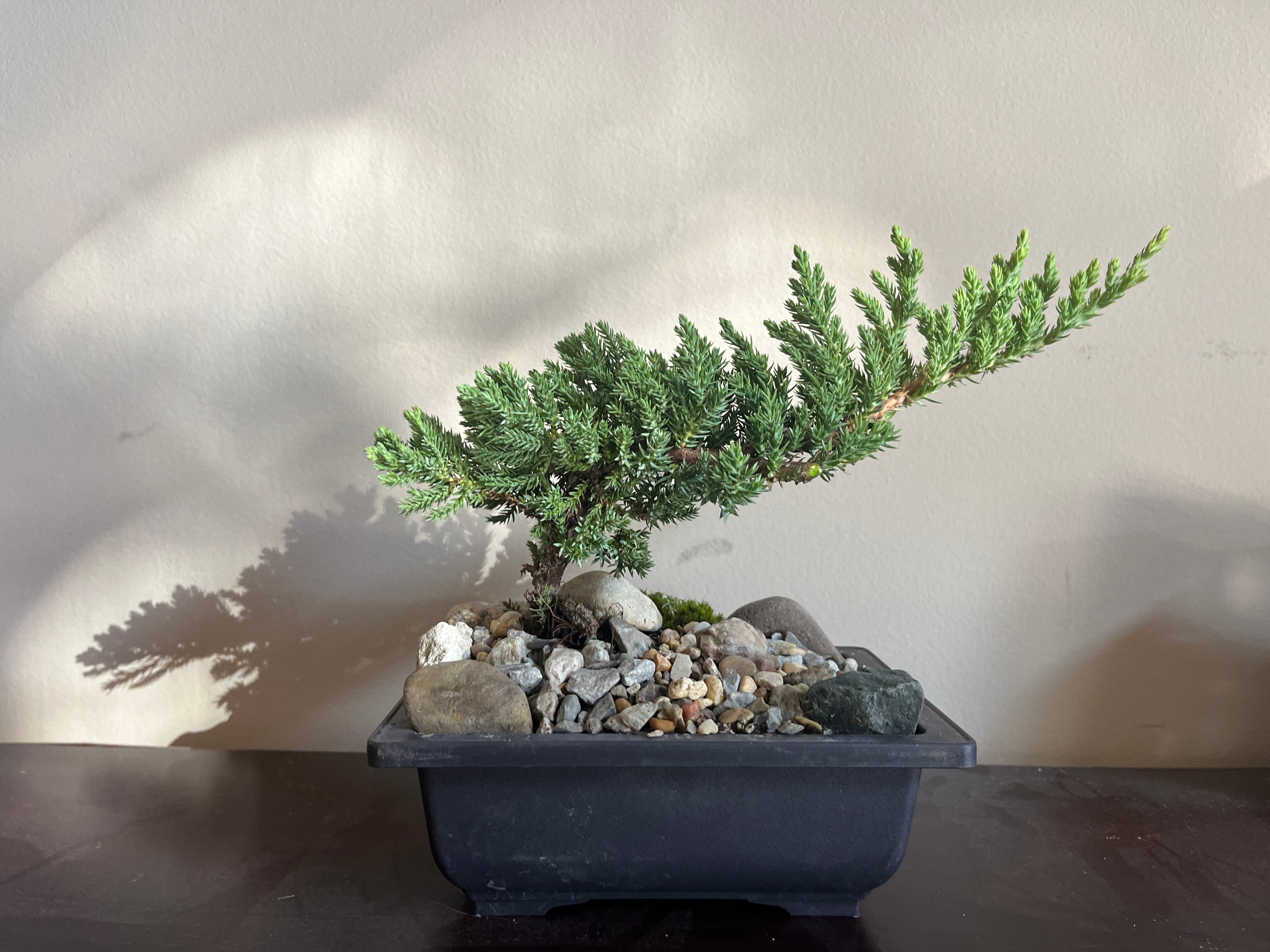 I took the tree out to our patio a few times each week. I let it out when it was raining. I took pictures and showed it off to my friends. Things were looking great for my little tree, until I started comparing the current color of the tree to the color from my first photos. The second my four-year-old Japanese Juniper came into my house, it started its gradual death.