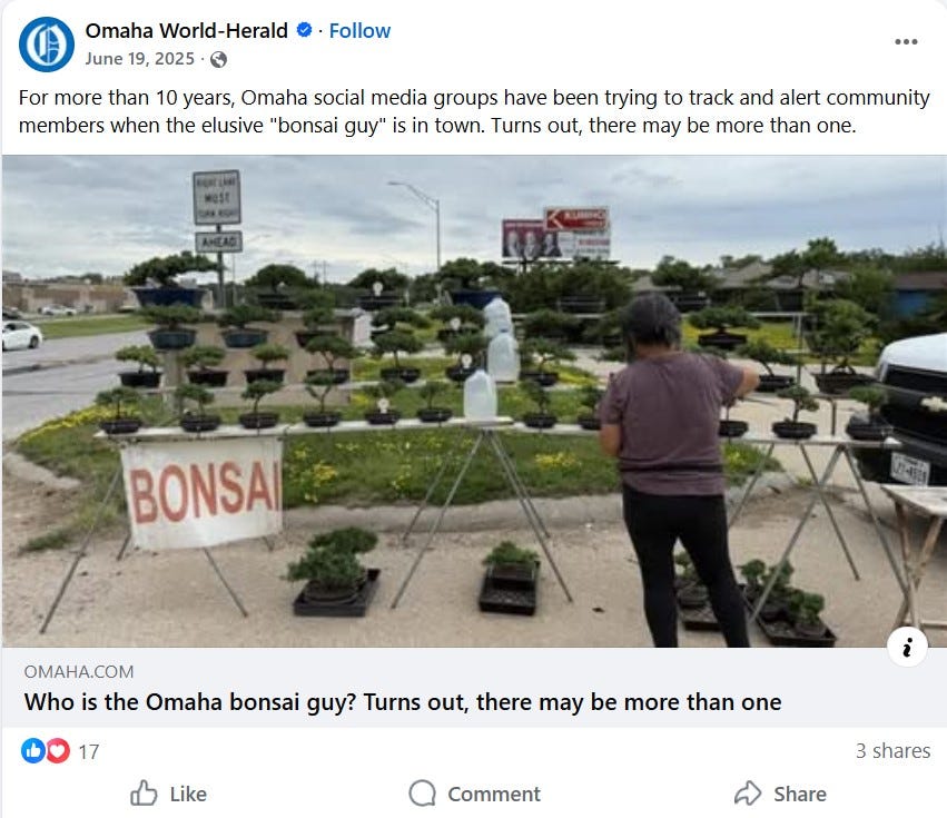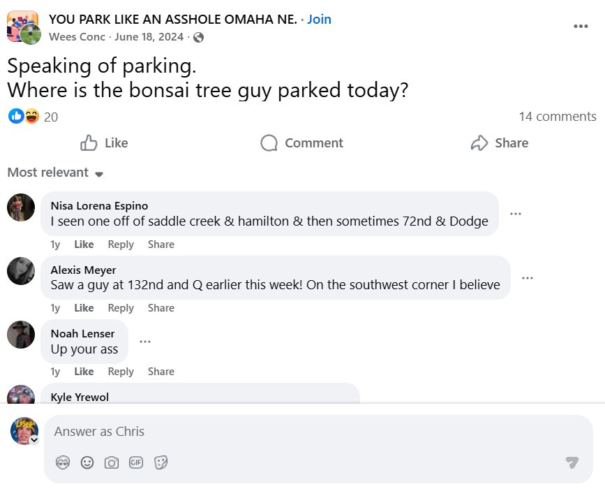 Shortly after purchasing and murdering my Japanese Juniper, the Omaha World Herald newspaper ran a story about “the Omaha bonsai guy.” Apparently he had quite the social media following. People seemed more intrigued in him than the art of bonsai trees. Well, most people. Everyone but Noah Lenser, who responded to a Facebook post asking, “where is the bonsai tree guy parked today?” with the specific location of “up your ass.”