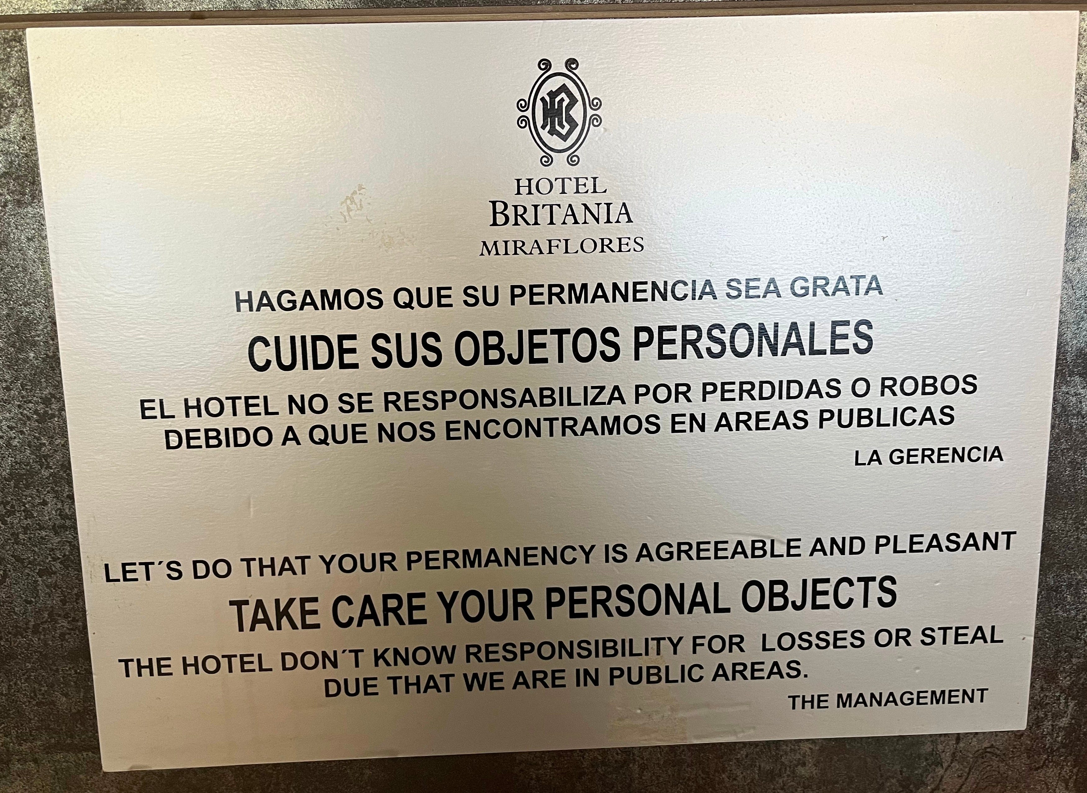 Or the sign in the lobby of a Peruvian hotel that read,