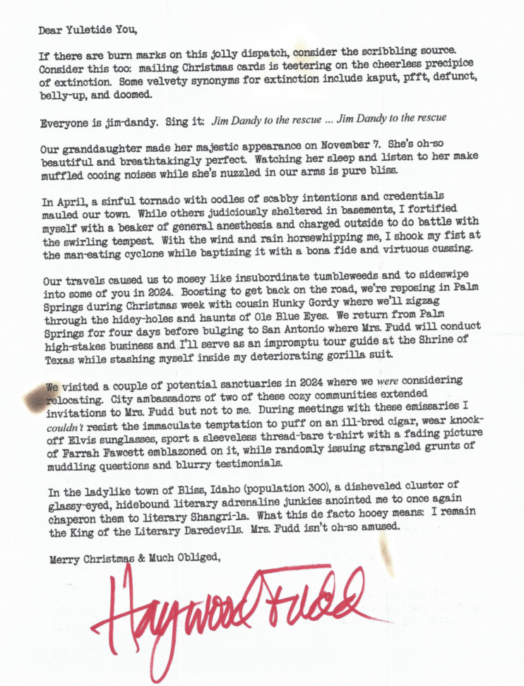 Our travels caused us to mosey like insubordinate tumbleweeds and to sideswipe into some of you in 2024. Boosting to get back on the road, we are reposing in Palm Springs during Christmas week with cousin Hunky Gordy where we’ll zigzag through the hidey-holes and haunts of old blue eyes. We return from Palm Springs for four days before bulging to San Antonio where Mrs. Fudd will conduct high-stakes business and I’ll serve as an impromptu tour guide at the Shrine of Texas while stashing myself inside my deteriorating gorilla suit.