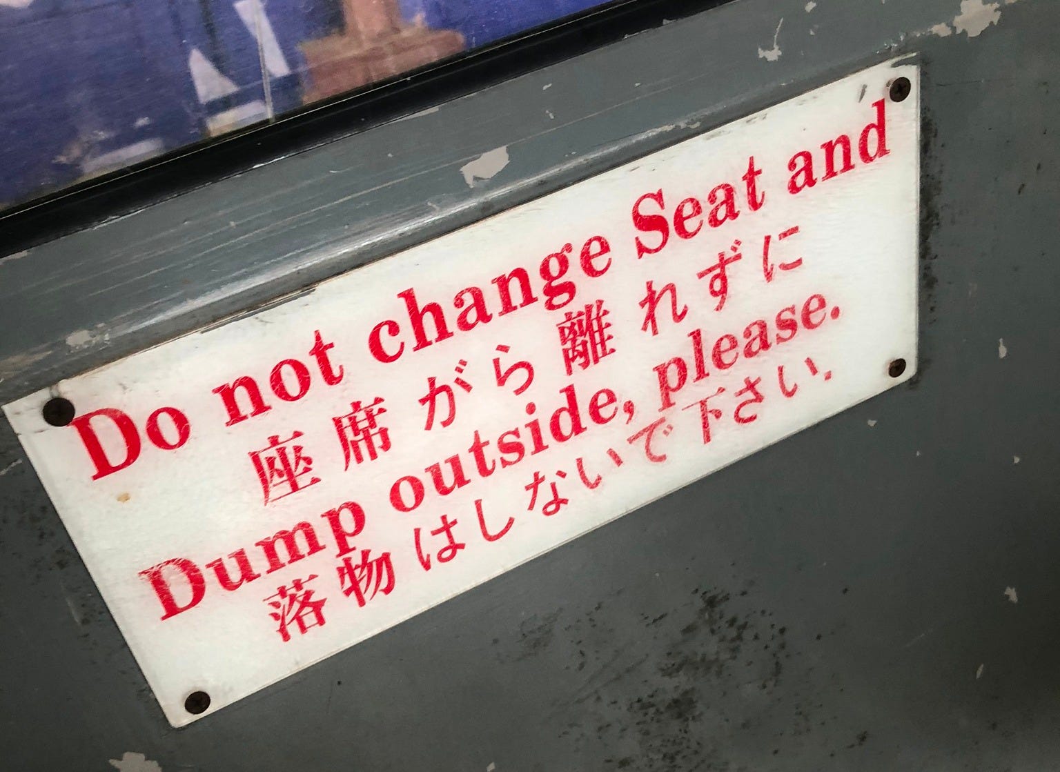 Just consider the gondola I rode in Guam that could have said, “please remain seated and do not throw anything outside,” but instead chose to instruct me, “Do not change Seat and Dump outside, please.”