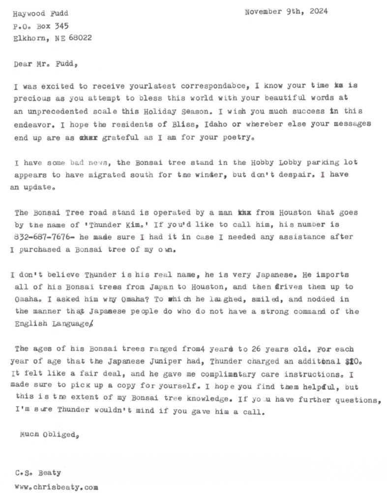 But like the dead stump I now use for decor in my basement, my interest in bonsai trees atrophied. It was just as well. Fudd had also seemed to move on to new topics. His next letter to me was his own recap of the year in the form of a Christmas card.