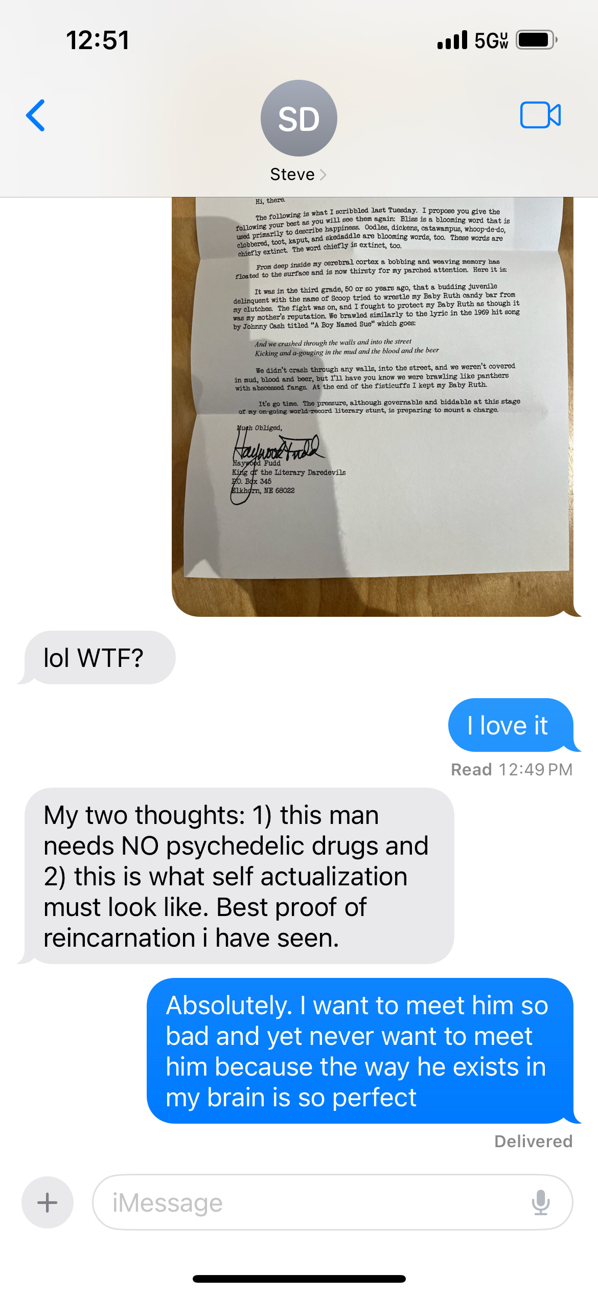 It was still early phases in our relationship. The first few dates had gone well, but now Fudd and I were getting to know what each of us was like when we didn’t feel the need to impress one another. When we didn’t get all glammed up before a night on the town. We were inching toward the wearing sweatpants and farting in front of one another phase of any meaningful partnership, but it was still exciting. Now that we were six letters in and things felt serious, I started bragging about my new pen pal with the people I cared about. It was about time they knew who this special person in my life was.